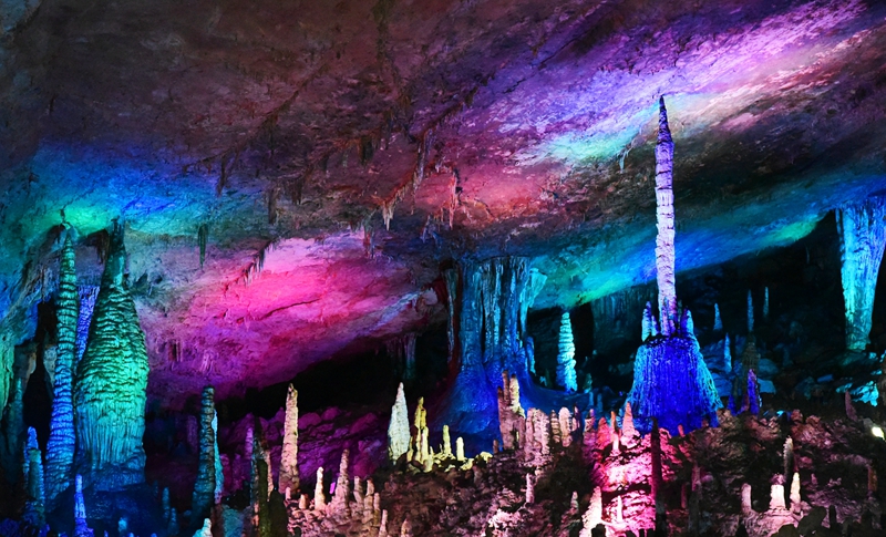張家界武陵源的黃龍洞,號(hào)稱世界溶洞奇觀,今年九月份,我懷著探秘的心境前來欣賞。洞內(nèi),頭一段路較為平坦,約百米,漸漸踏上了石階,燈光灰暗,眼前的一切都顯得模糊,導(dǎo)游小邱說洞中有幾層,展現(xiàn)在眼前的是一個(gè)豪華的“歌舞廳”,我想那龍王和他的子孫們在重要的節(jié)日定然在這舞廳展示風(fēng)采吧!殿堂里燈光不停的閃爍,色彩斑闌,隱隱約約看見它的小女兒正在與情人約會(huì),手牽手低低切切,情意綿綿……這個(gè)大廳名曰:“龍舞廳”,之外,還有天堂宮、天仙宮、后宮、龍宮……