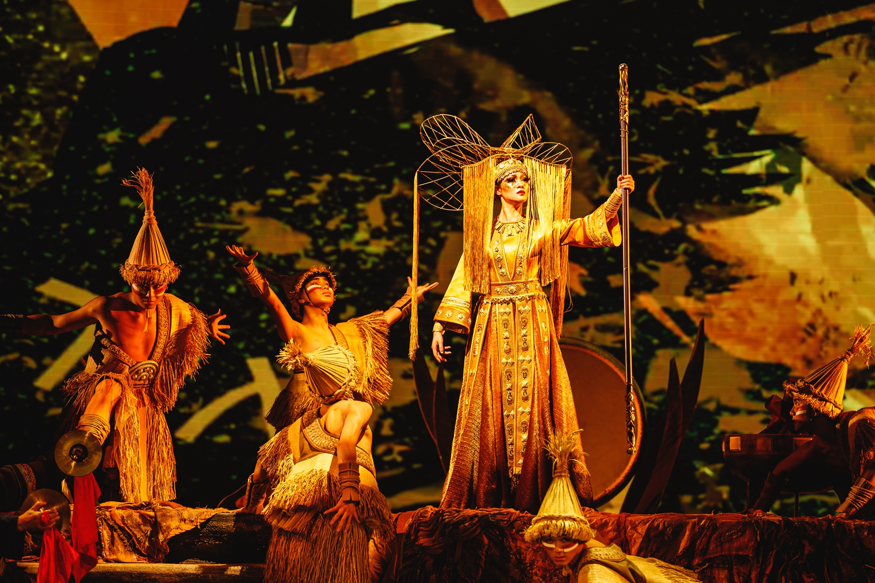 強(qiáng)勁的節(jié)奏在祠堂上空響起,赤裸上身、身著原始草裙的村民肅立成陣,跳起了土苗民族的茅古斯舞;舞臺(tái)中心的升降臺(tái)載著裝扮華麗神秘的女祭司慢慢升起,作為這場(chǎng)儀式的指揮,她的吟唱仿佛統(tǒng)領(lǐng)著整個(gè)森林山谷中的所有神力......